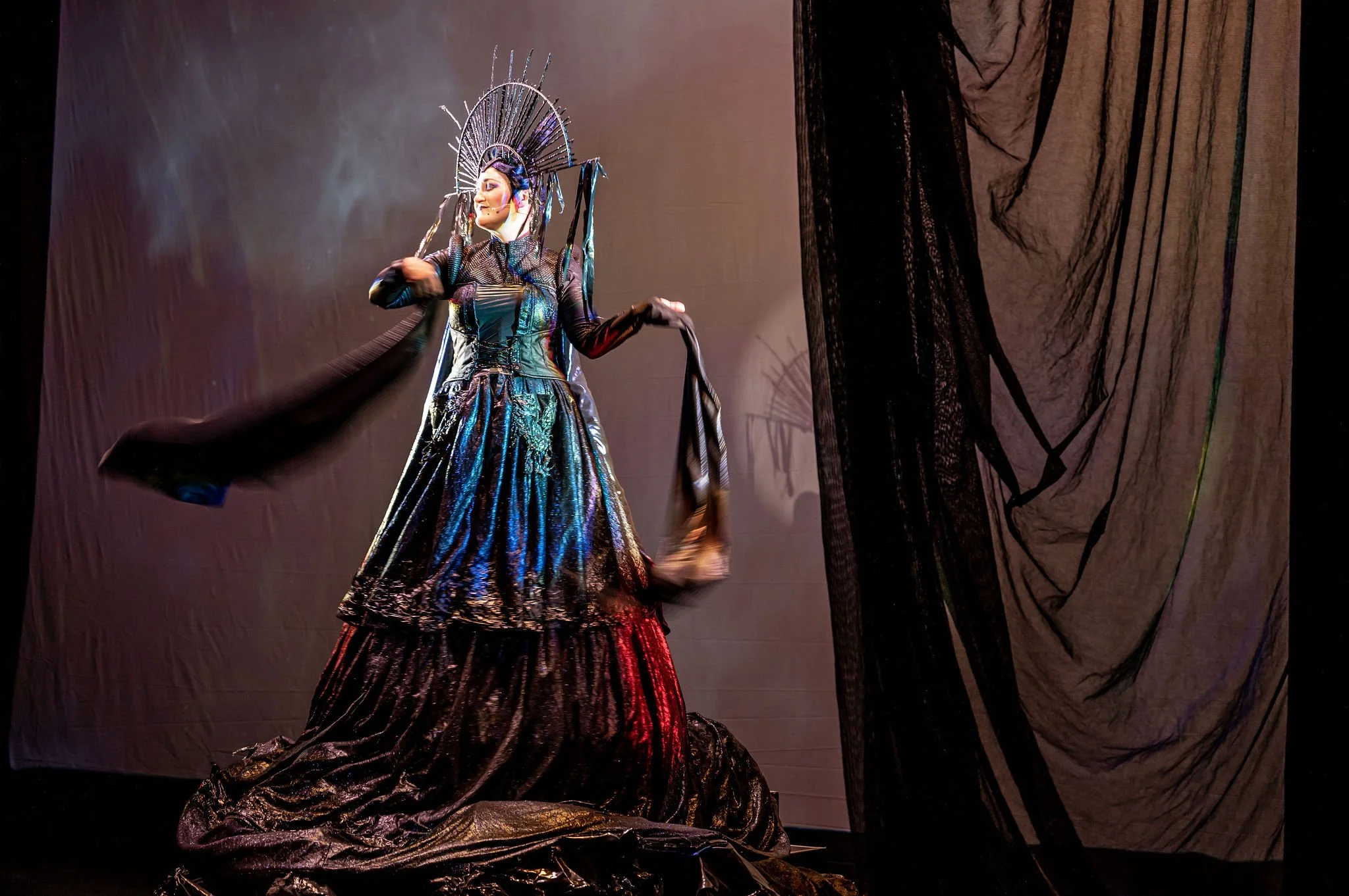 Teiya Kasahara 笠原貞野 in Nightwood Theatre’s production of The Queen In Me, 2022 (co-produced by Amplified Opera, Canadian Opera Company, and Theatre Gargantua). Pianist David Eliakis, co-directors Andrea Donaldson and Aria Umezawa, set and costume designer Joanna Yu, lighting designer André du Toit, projection designer Laura Warren. Photo: Dahlia Katz.